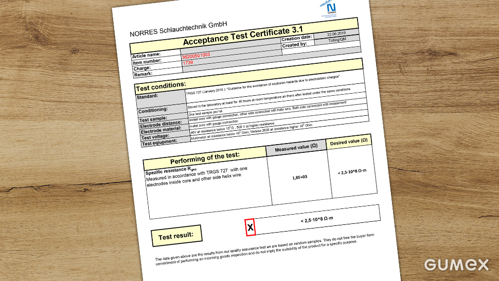 Messprotokoll über die Leitfähigkeit der Schläuche dient als Nachweis der elektrischen Leitfähigkeit der Schläuche. Wenn der Schlauch mit Erde verbunden (also geerdet) ist, kommt es zu keiner elektrischen Entladung während seines Gebrauchs. Dieses Messprotokoll über die Leitfähigkeit der Schläuche wird dem Kunden auf Anfrage geliefert, diese muss jedoch bereits zum Bestellzeitpunkt des jeweiligen Schlauchs vorliegen.