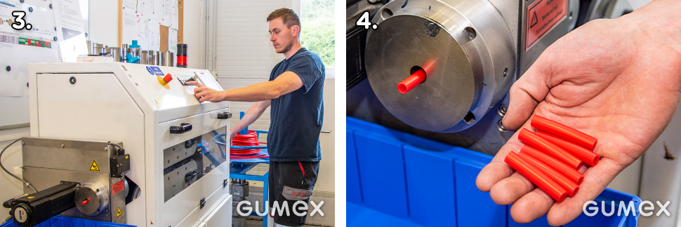 Wir schneiden nicht nur das von GUMEX gelieferte Material, sondern auch die vom Kunden bereitgestellten Profile, Röhrchen und Kunststoffrohre, und zwar schnell, präzise und in hoher Qualität mit unserer vollautomatischen Schlagmessermaschine – Produktion von Serien mit einigen hundert bis zu vielen tausend Stück.